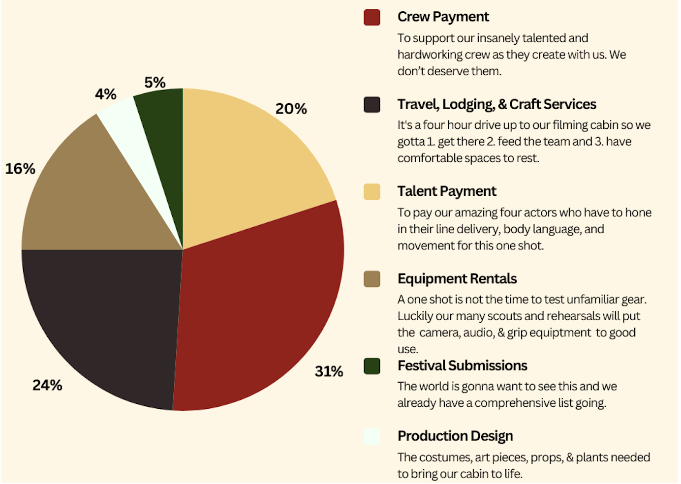 Our budget focuses on providing comfortable accommodations for our cast and crew, turning our beautiful cabin location into a more sinister one, and ensuring we have the equipment needed for our team to make this film.